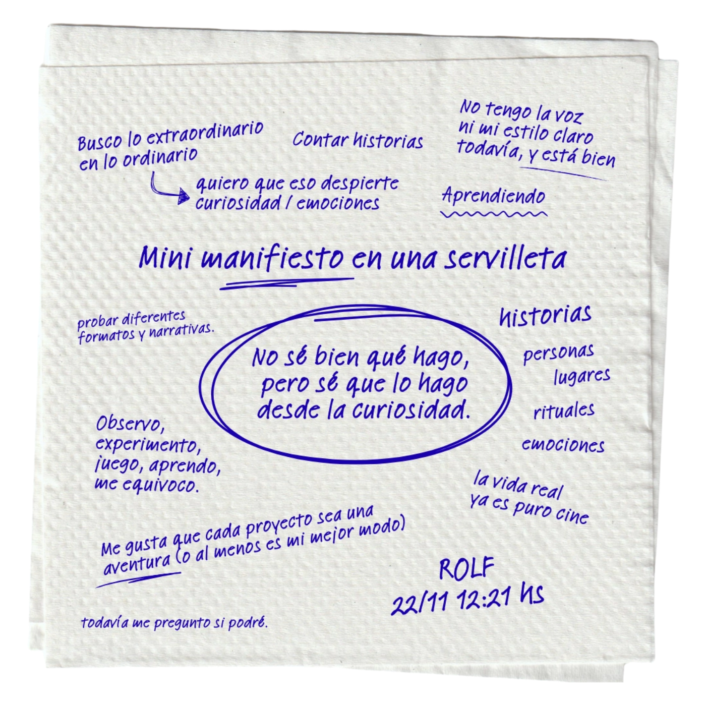 Mi objetivo es que en diez años esta bio diga: "Soy Rolf, artista audiovisual, a los 50. Tal vez me conozcan de pelis como PERRITO, Japoncolía o {inserte aquí lo que pueda surgir a futuro}."